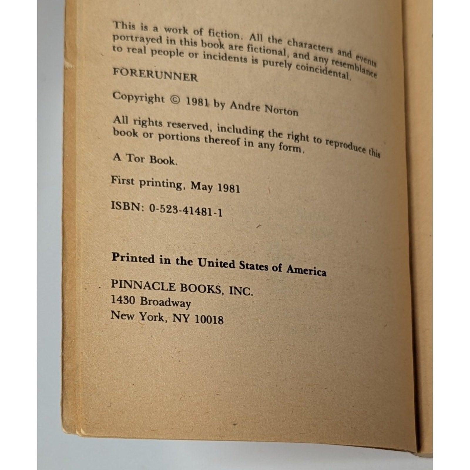 Lot includes first 2 books of the Forerunner story from Andre Norton. Each book is in acceptable condition with plenty of wear to the cover and pages. The paperback version of Forerunner is marked as a first printing. The hard cover edition of Forerunner Second Venture is not a first print.