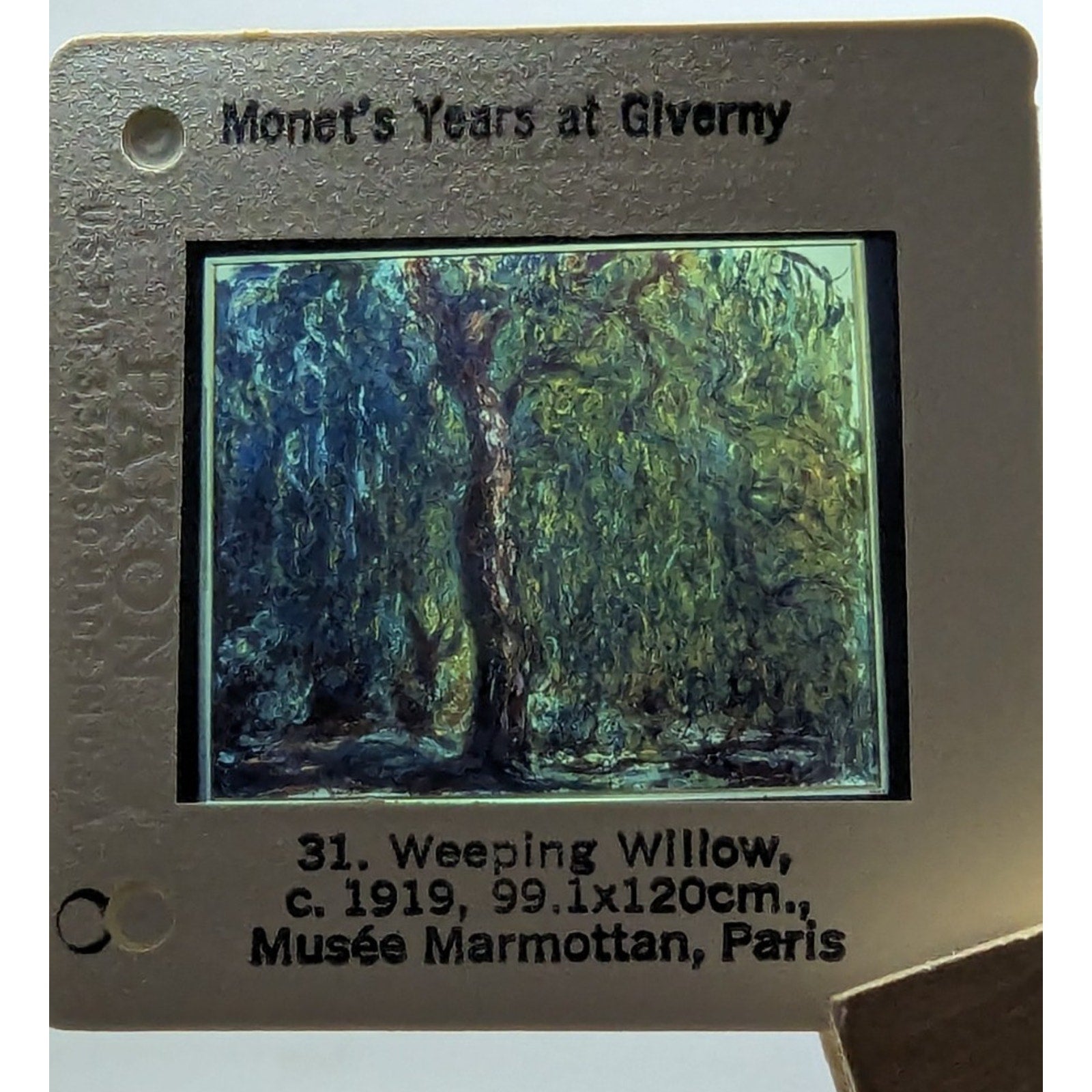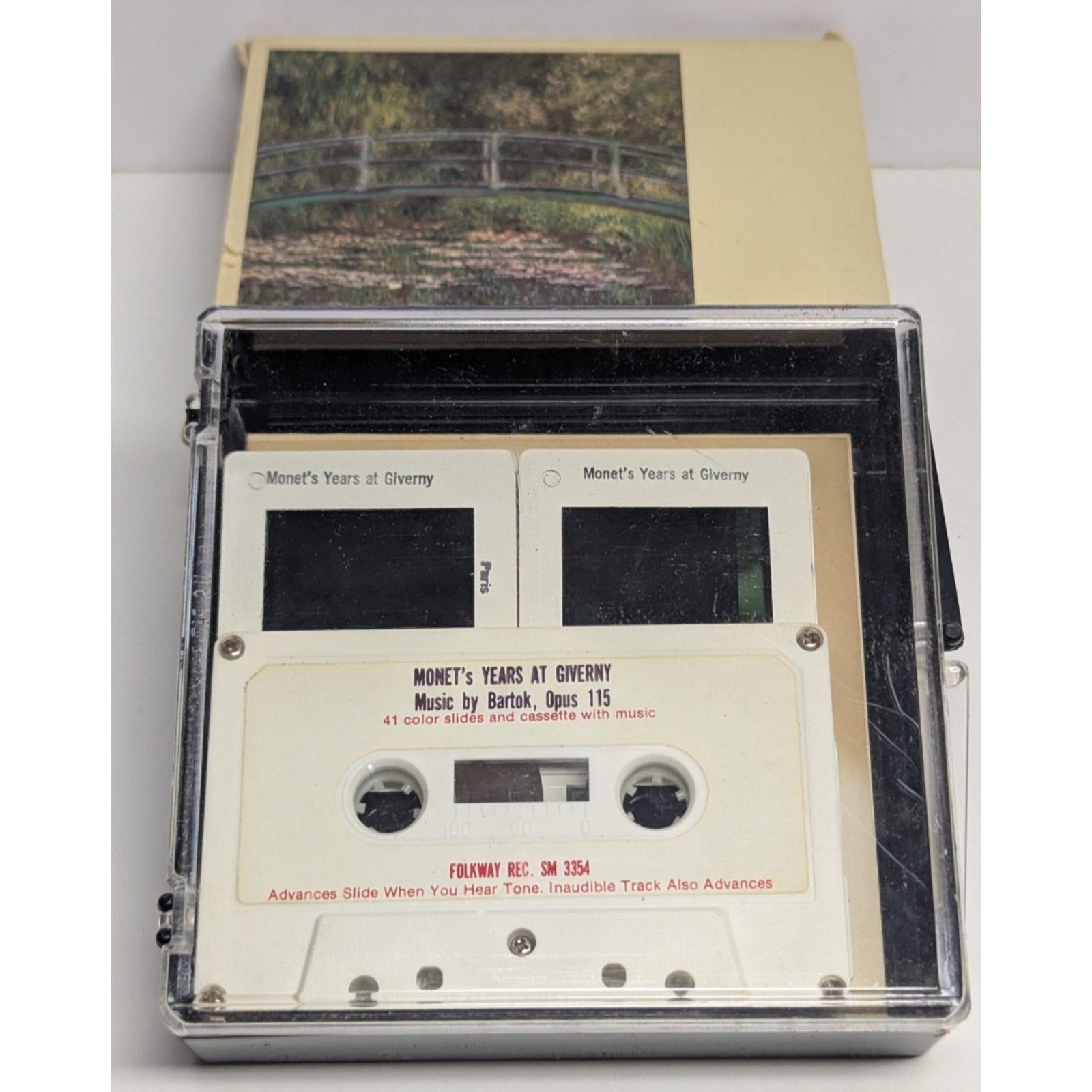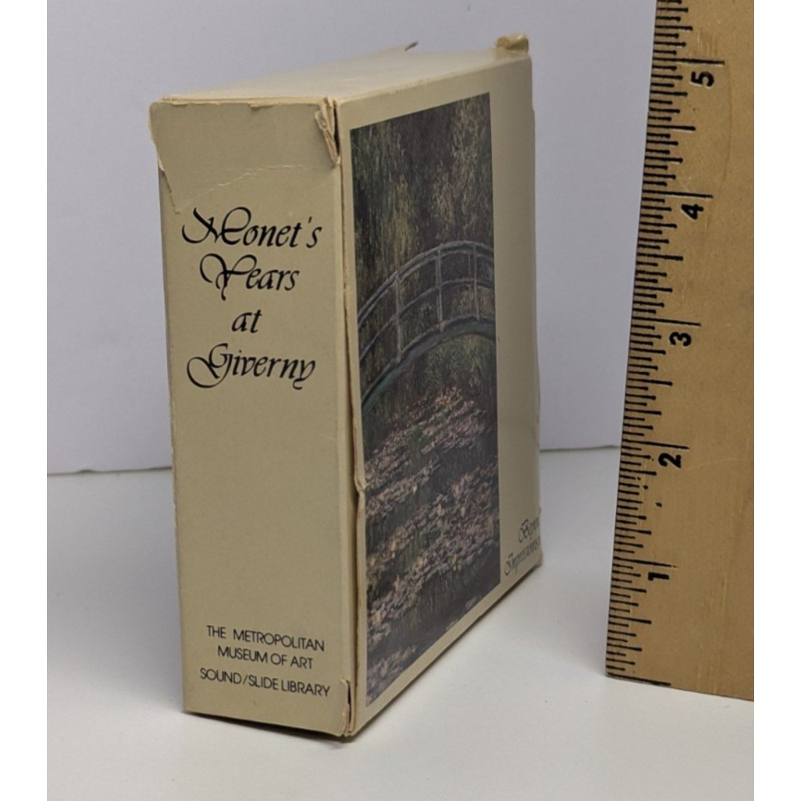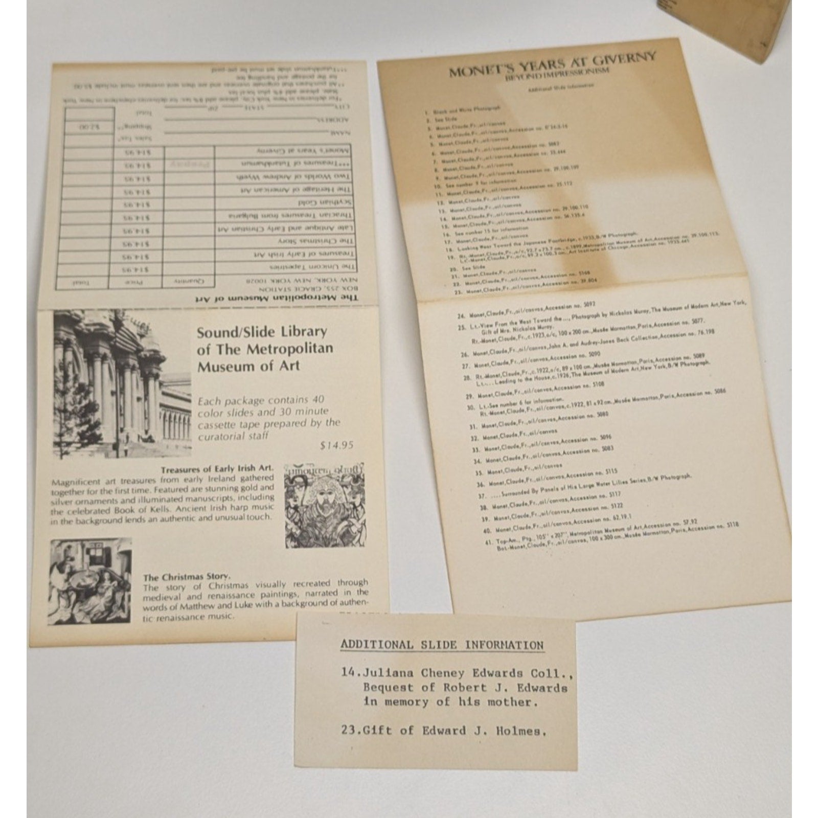 The Beyond Impressionism set from The Metropolitan Museum of Art lot includes all 41 slides, order from and informational paperwork, and a 30 minute cassette covering Monet's Years at Giverny. Photos show a few examples of the slides and the cassette has been tested and is in working condition.