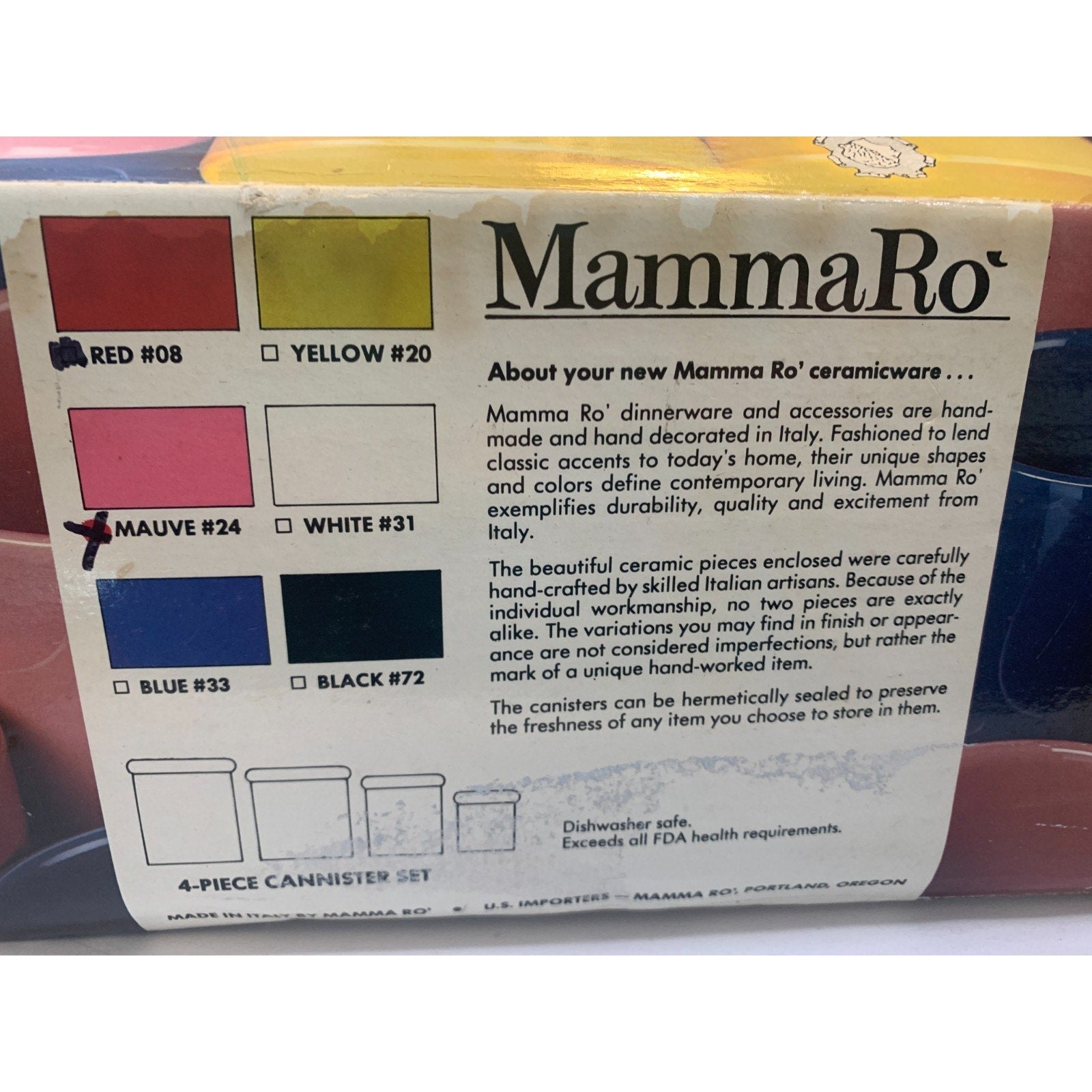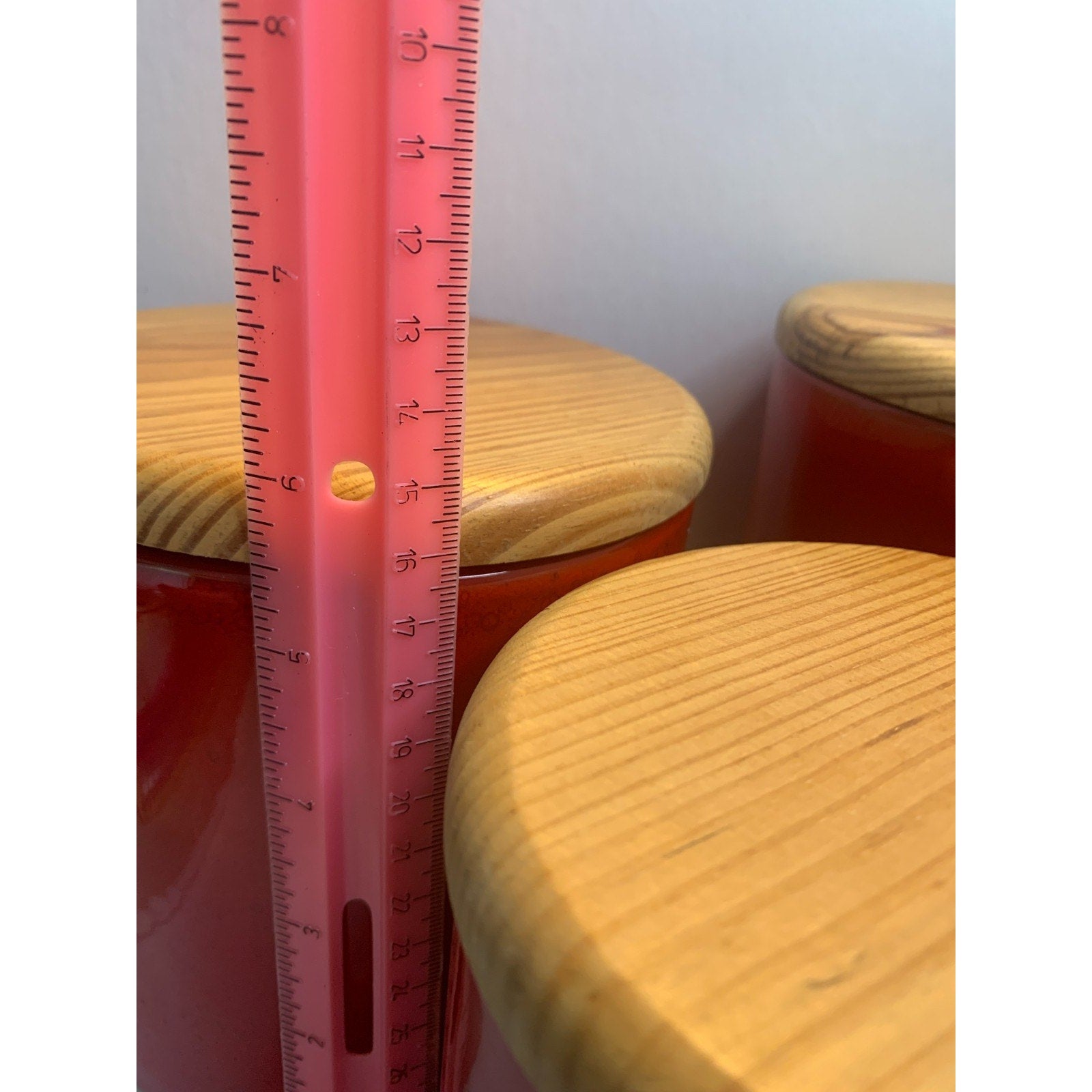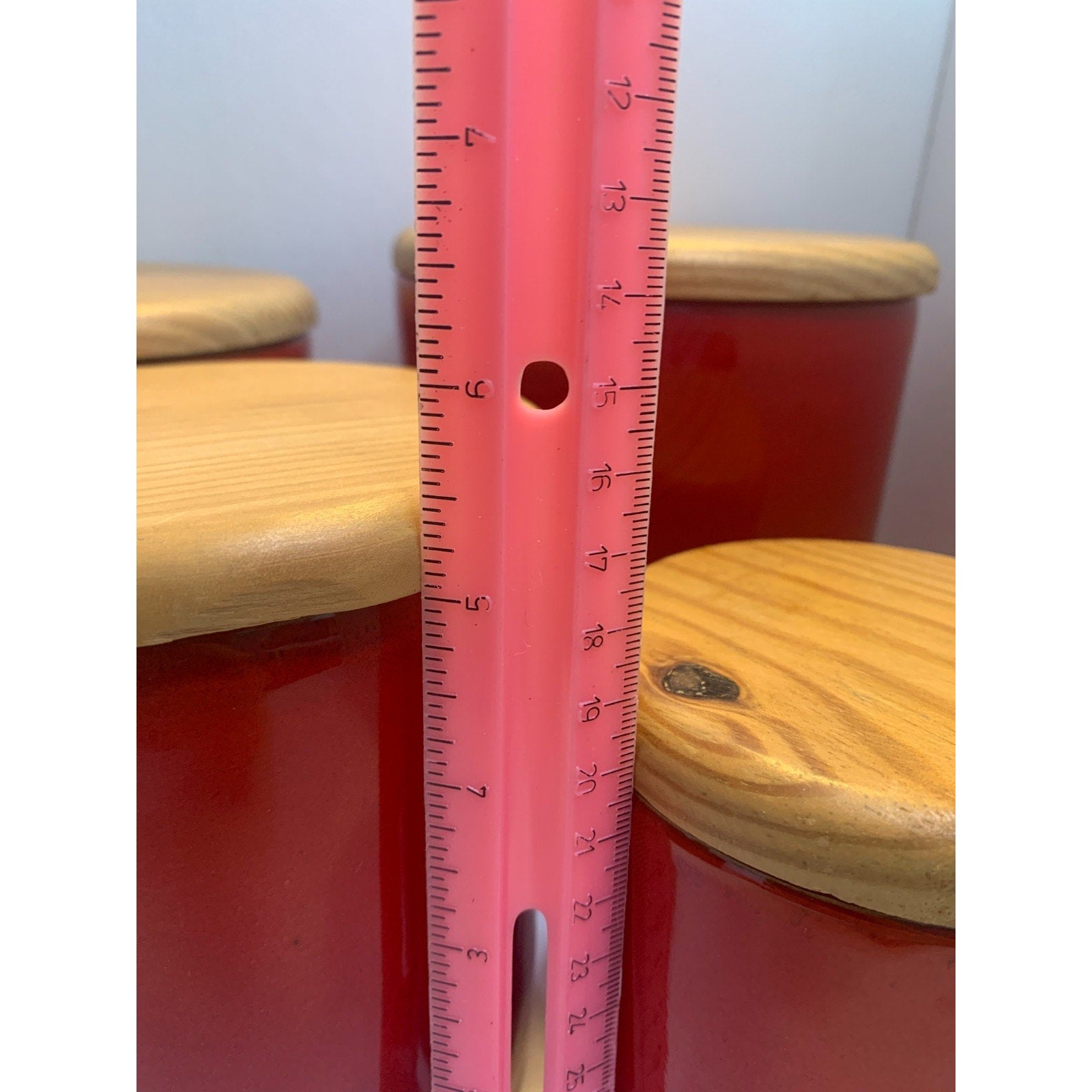 Set of 4 Vintage Mamma Ro Red Conisters with Wood Lids. These were new old stock from a kitchen ware store that went out of business years ago. The box has some damage but the canisters and lids/seals are in great condition. The two smaller canisters have some slight crazing on the outside, hard to see but tried to show in photos. No cracks or chips on any canisters.