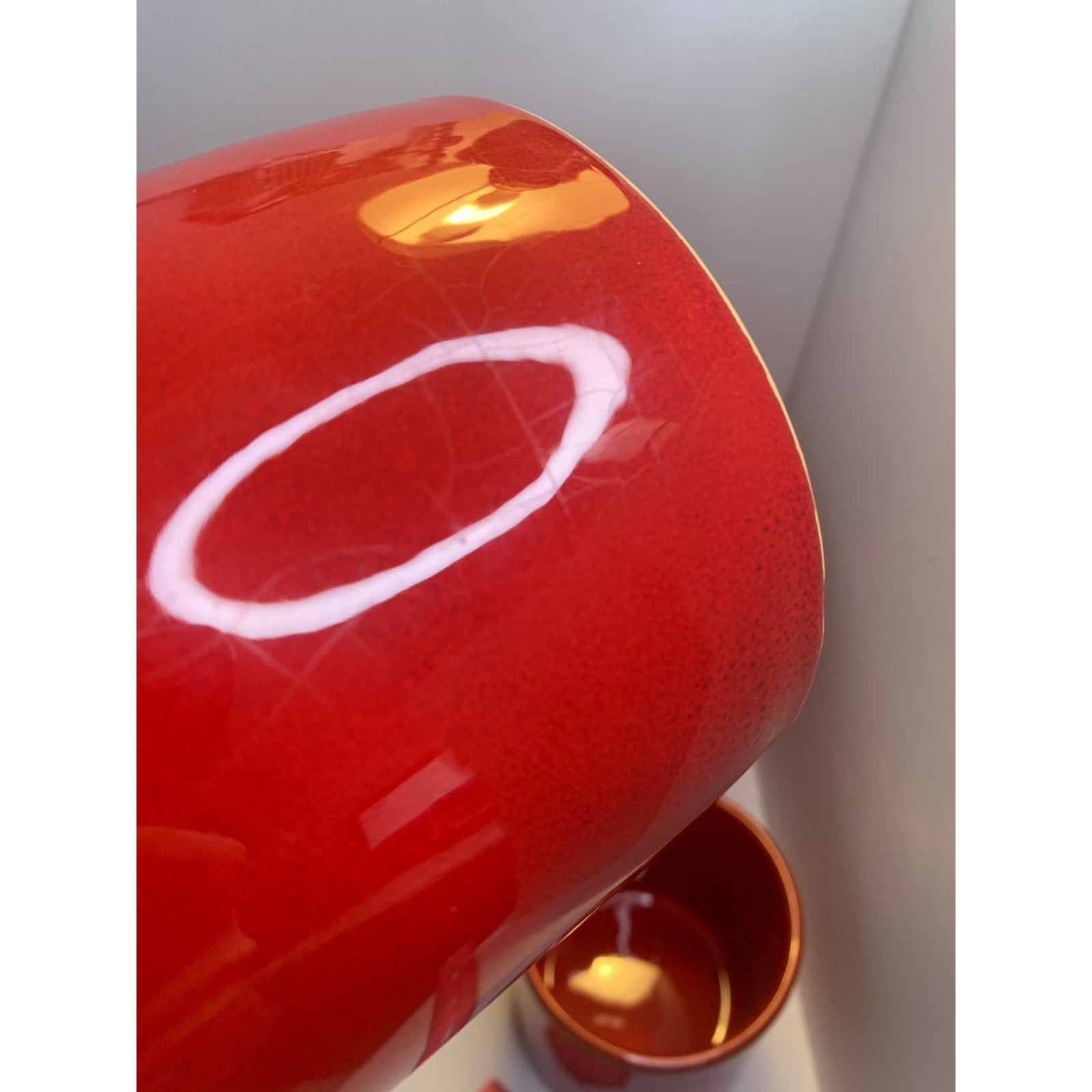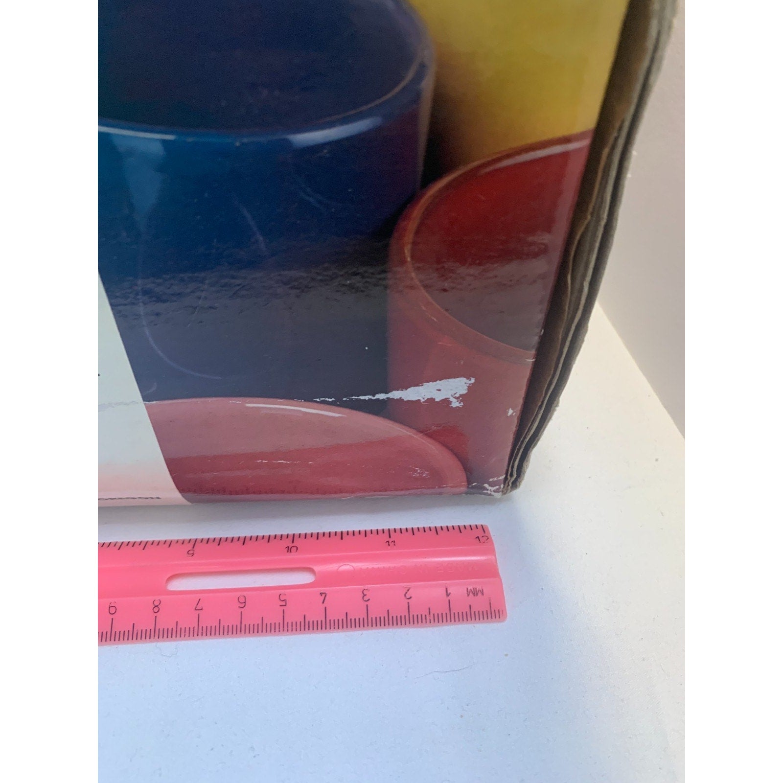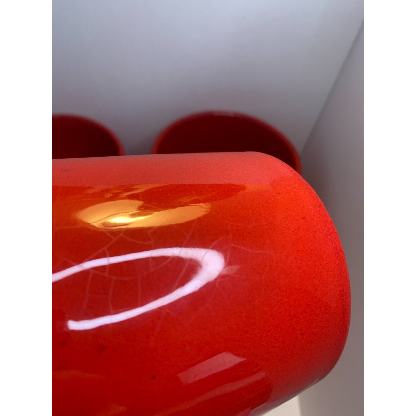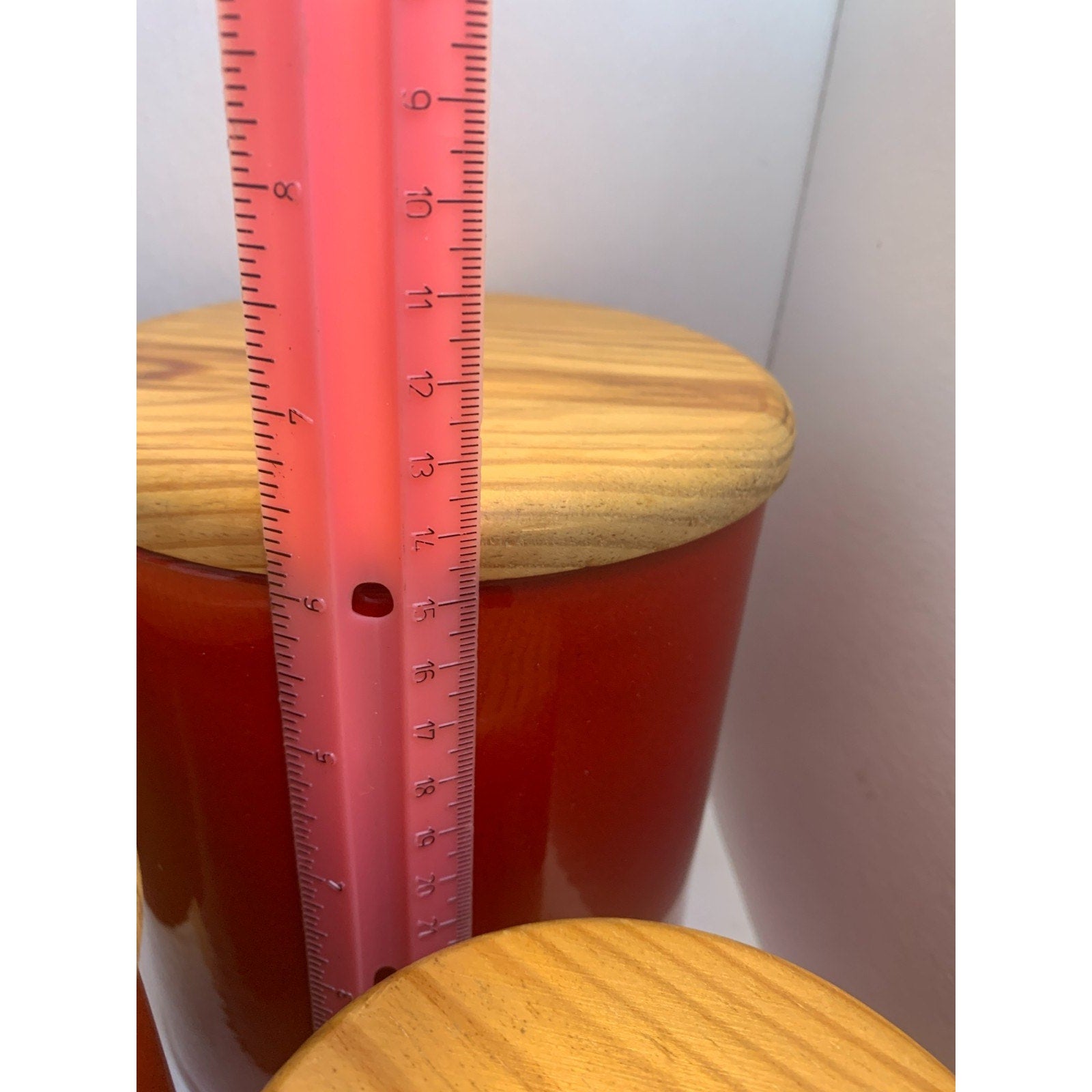 Set of 4 Vintage Mamma Ro Red Conisters with Wood Lids. These were new old stock from a kitchen ware store that went out of business years ago. The box has some damage but the canisters and lids/seals are in great condition. The two smaller canisters have some slight crazing on the outside, hard to see but tried to show in photos. No cracks or chips on any canisters.