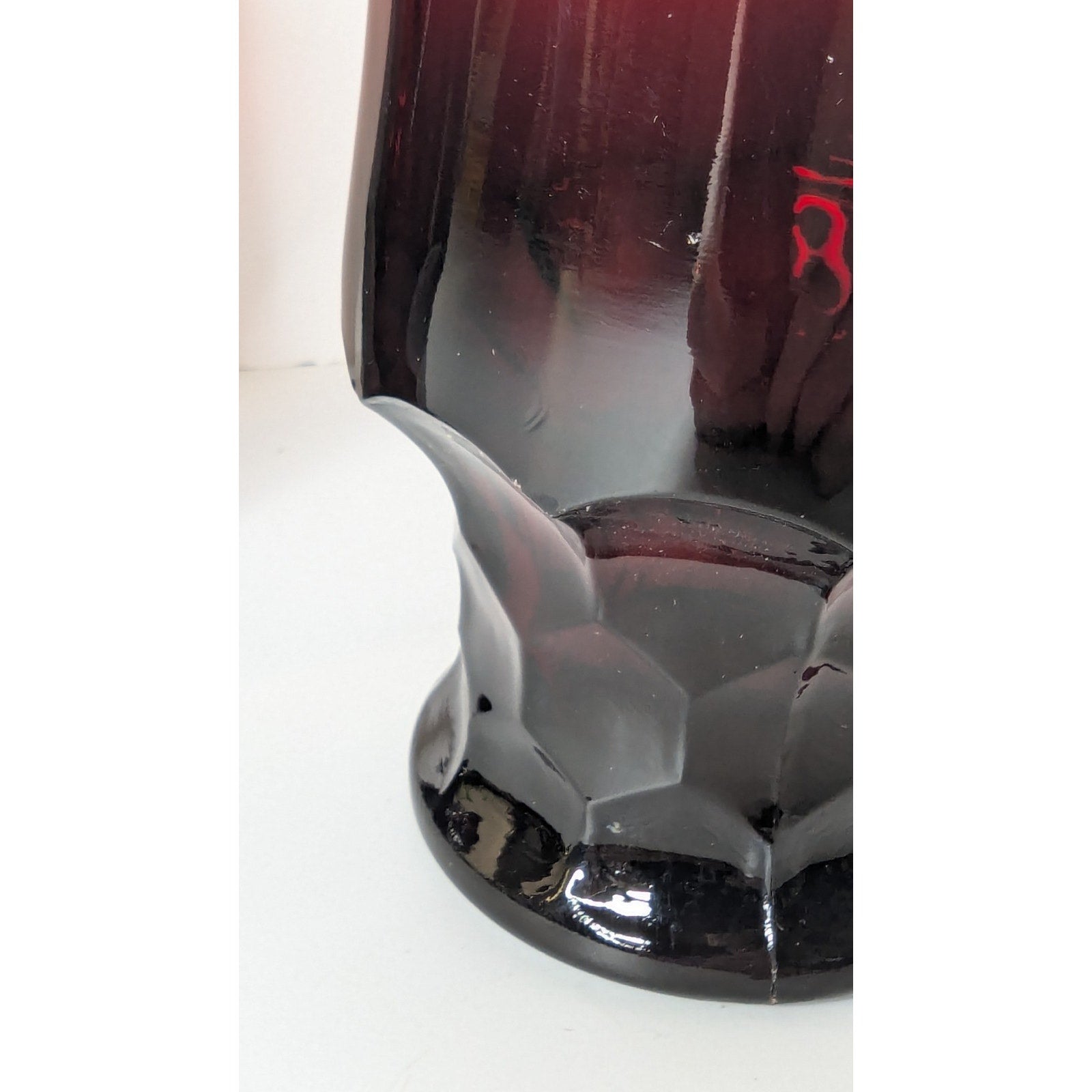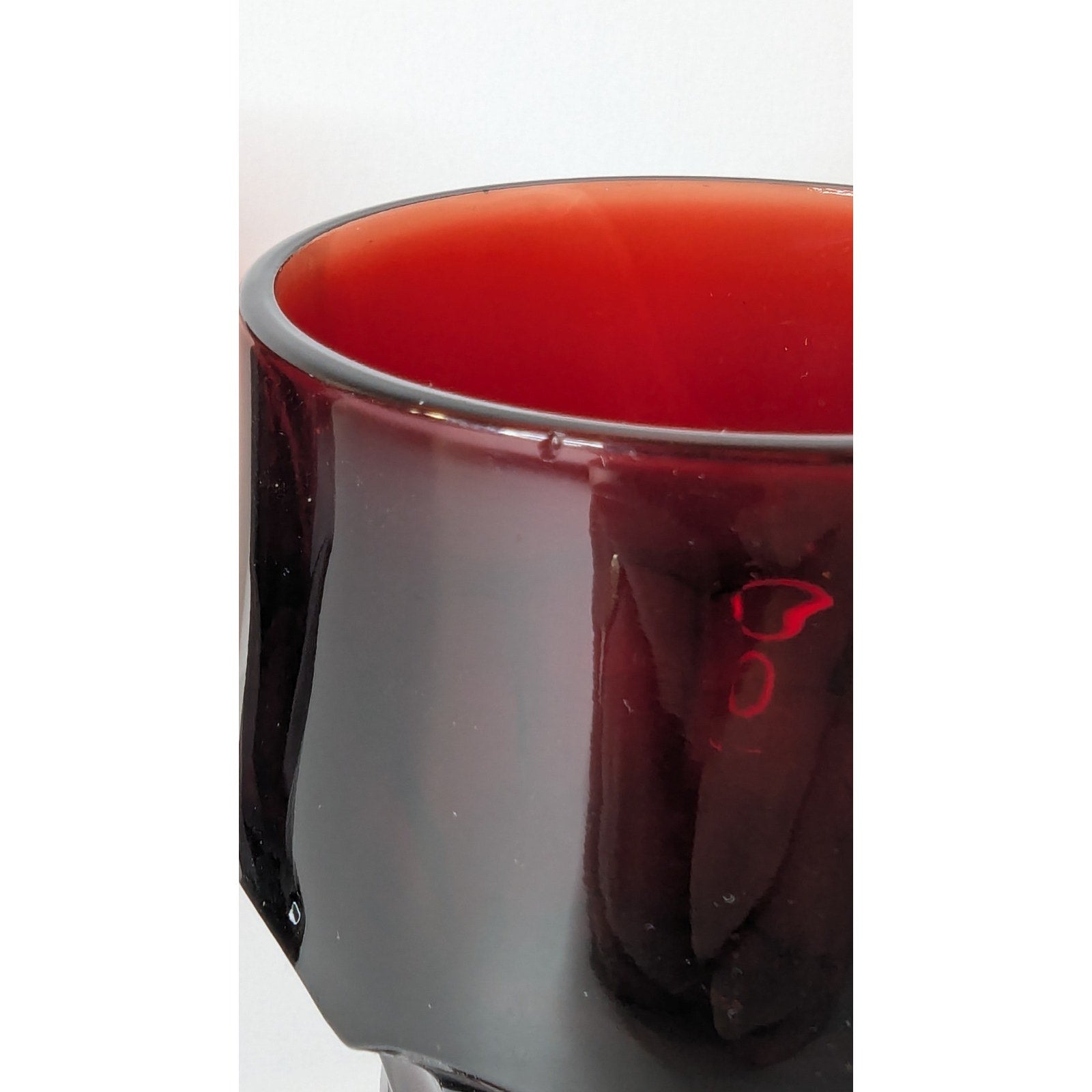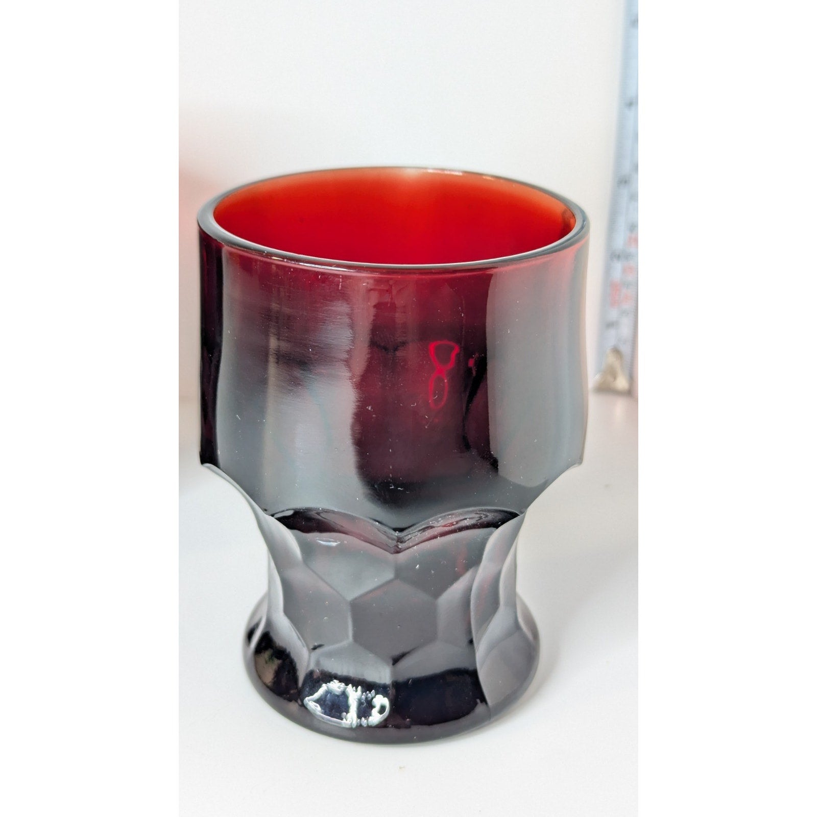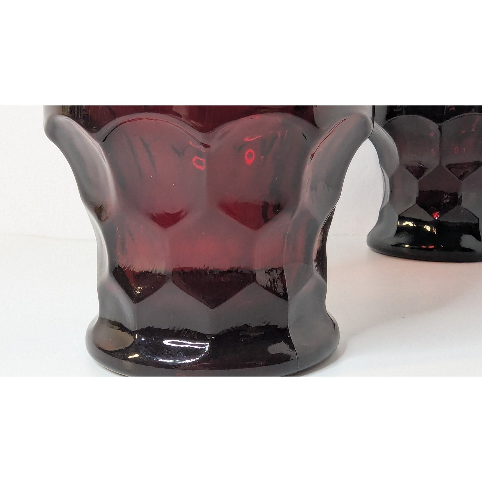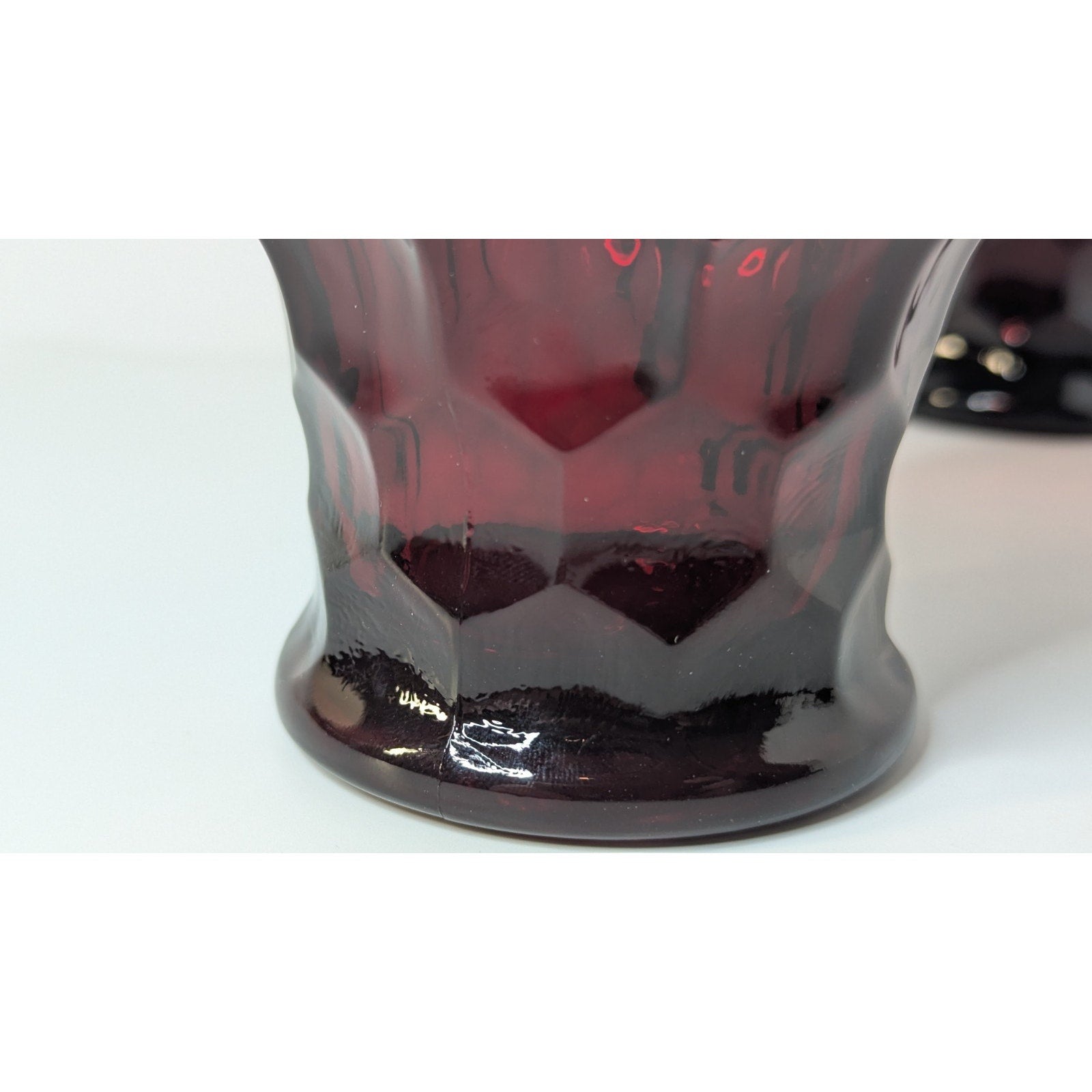 This set of vintage ruby red Georgian Tumblers are from Anchor Hocking. They are in used condition and have plenty of scuffs, shown in photos.
