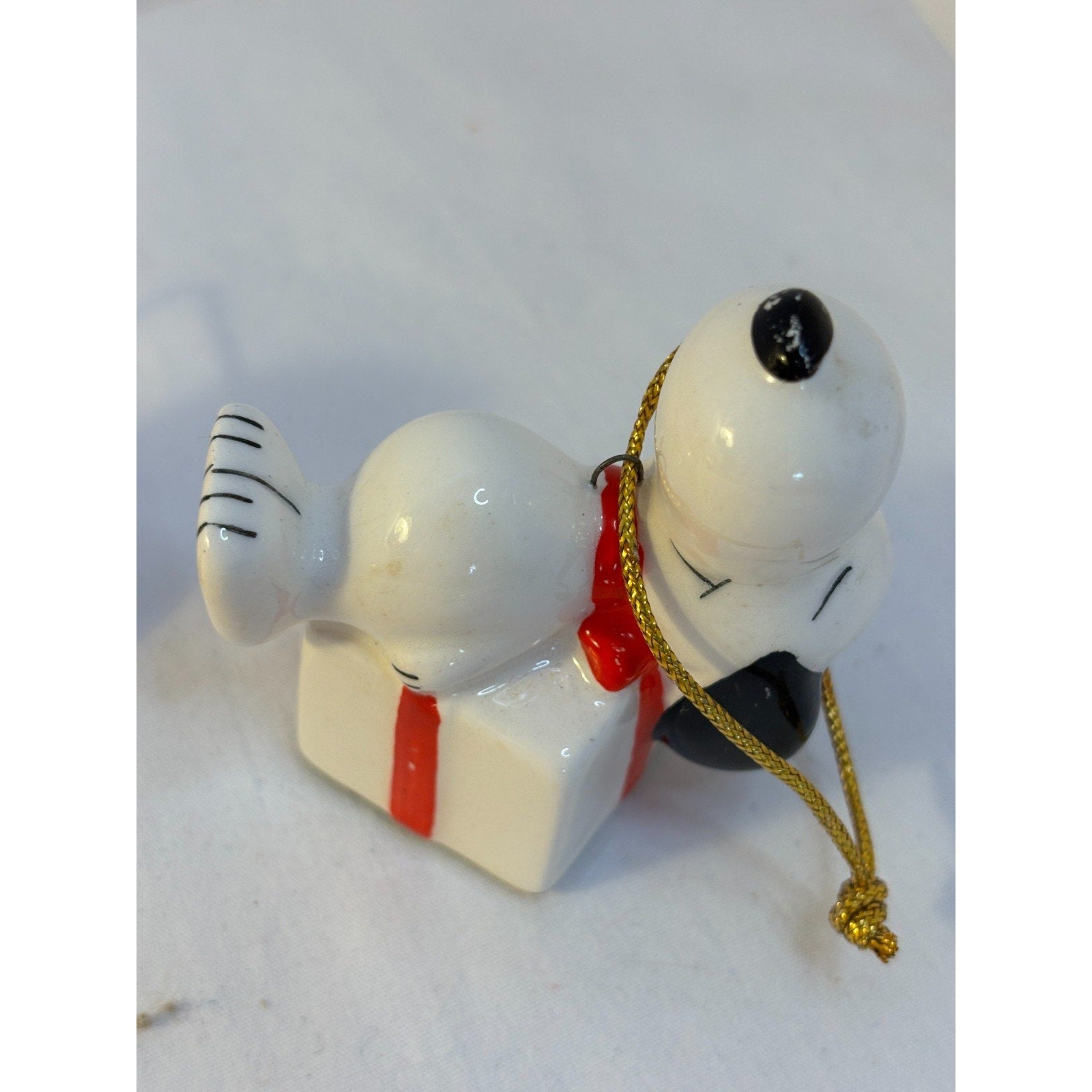 Two Vintage Snoopy Peanuts Ceramic Christmas Gift Present Wreath Ornaments Japan. Stamps on bottom say either 1950s or 1960s. Some paint wear but neither appear to have any cracks or chips. Tallest ornament measures approx 2.5 inches tall.