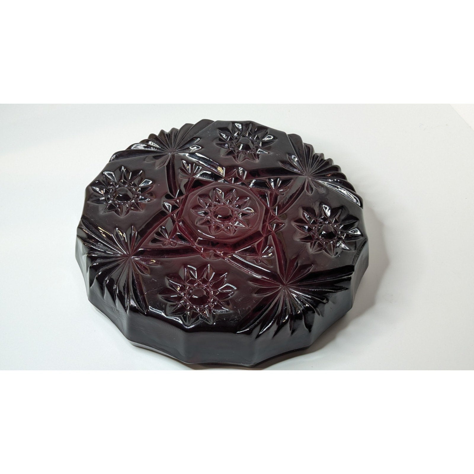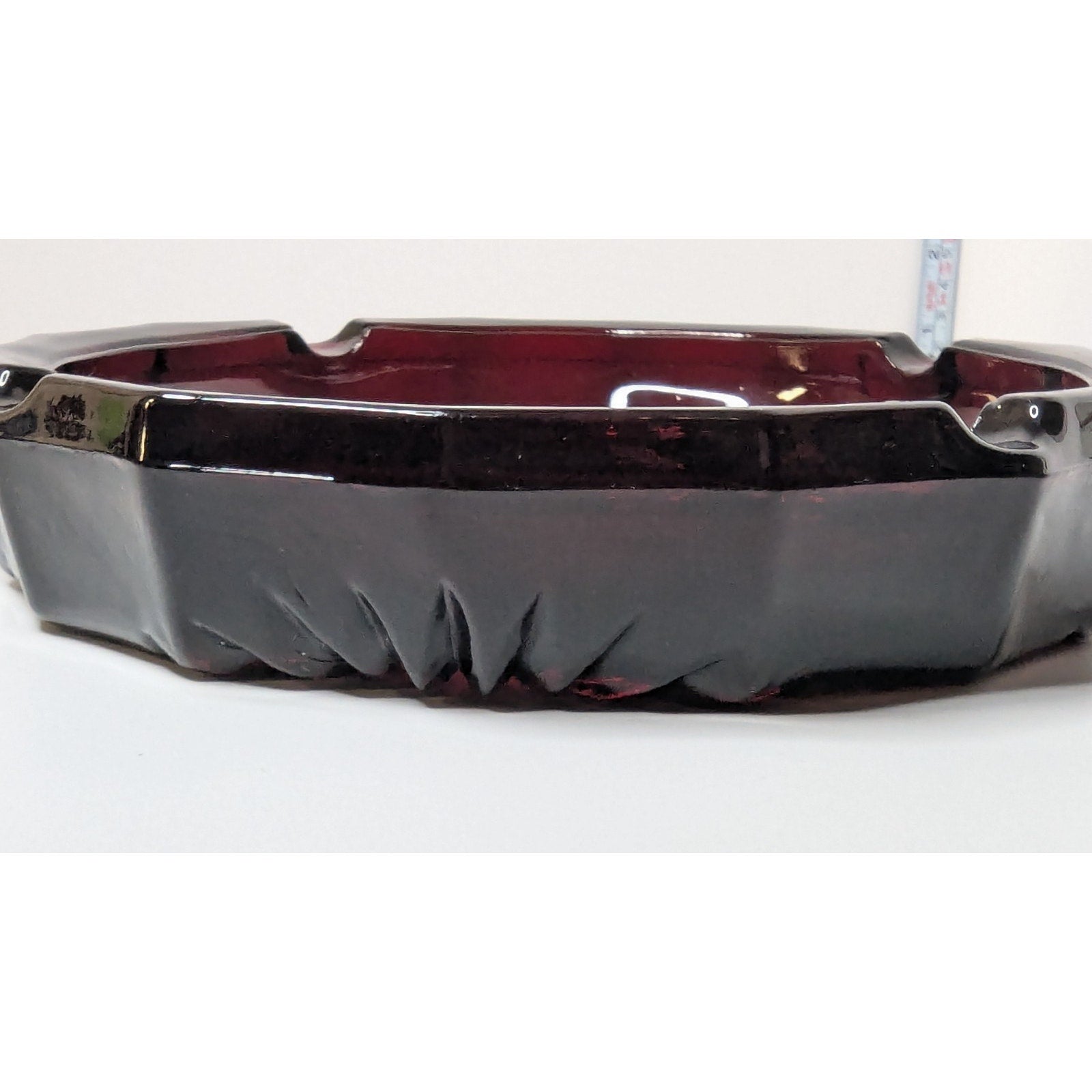 This ruby red glass ashtray measures just under 8 inches across. It is in used condition with plenty of scuffs and scratches, shown in photos.