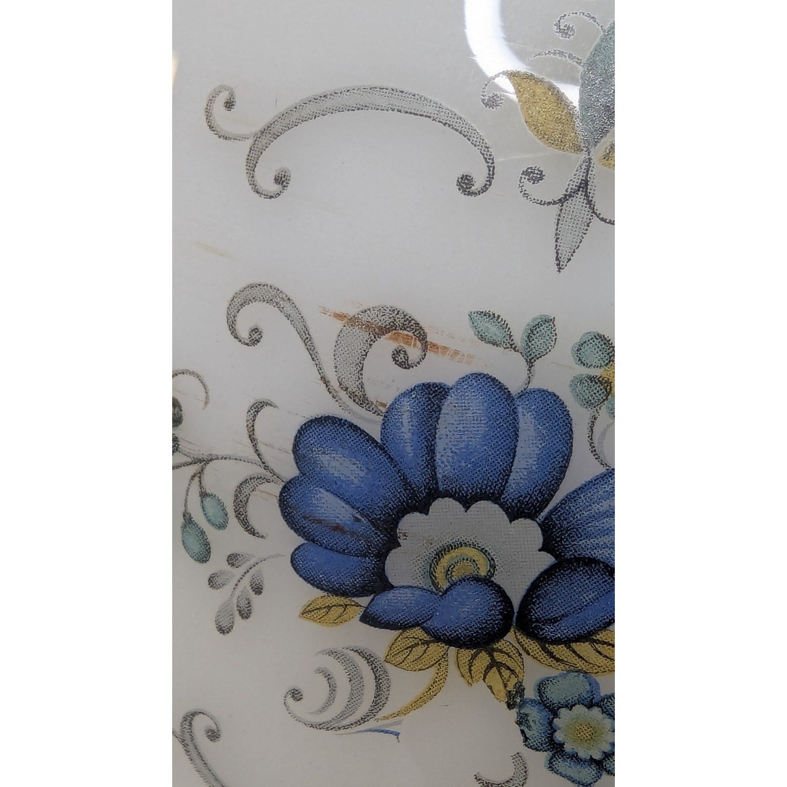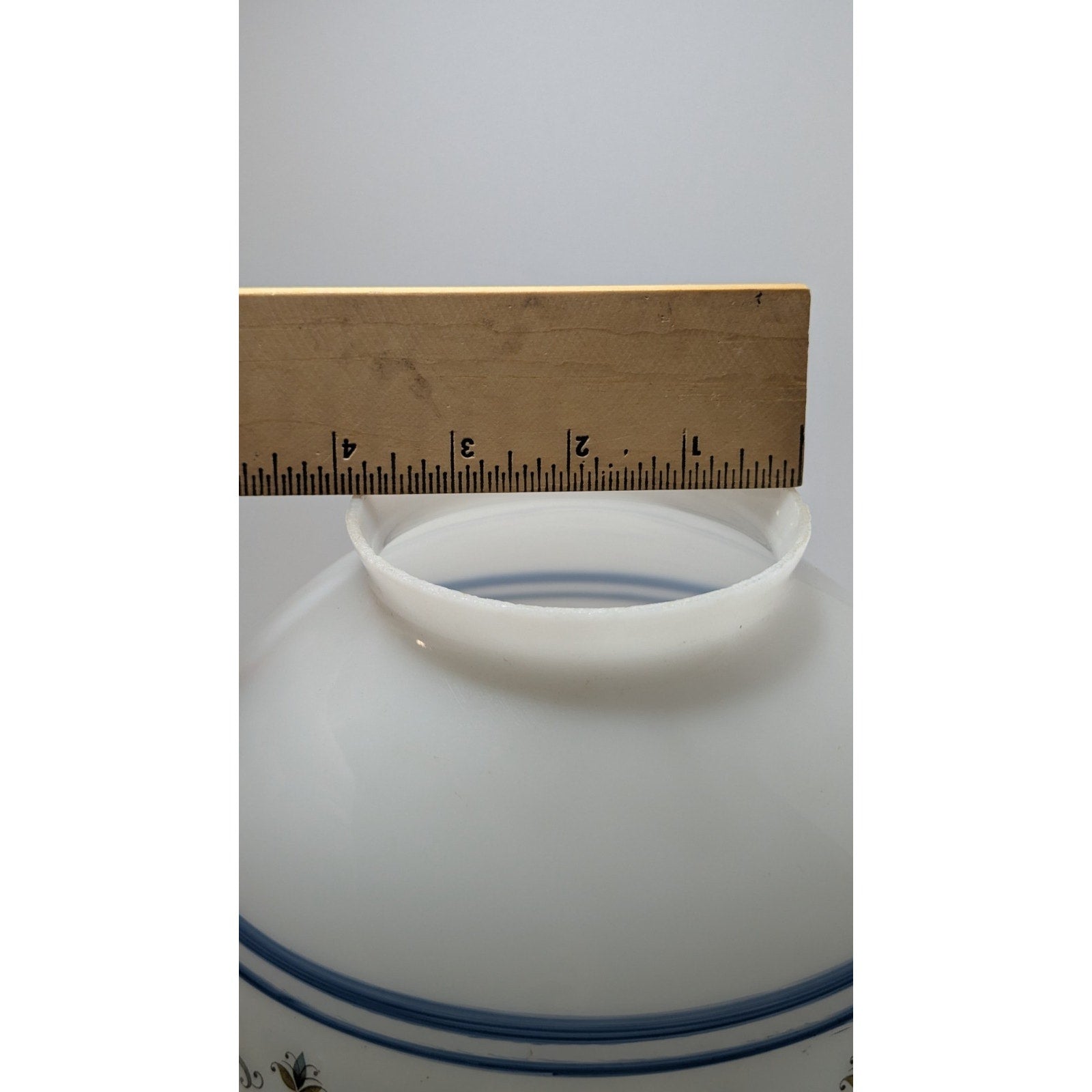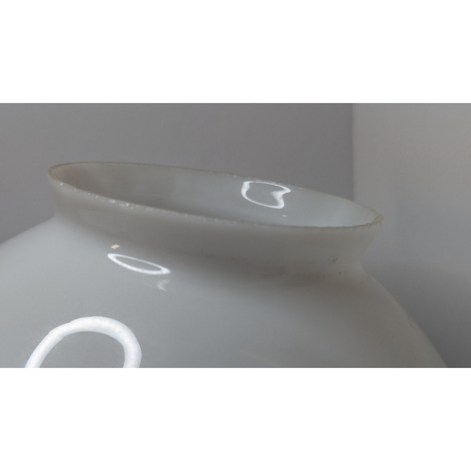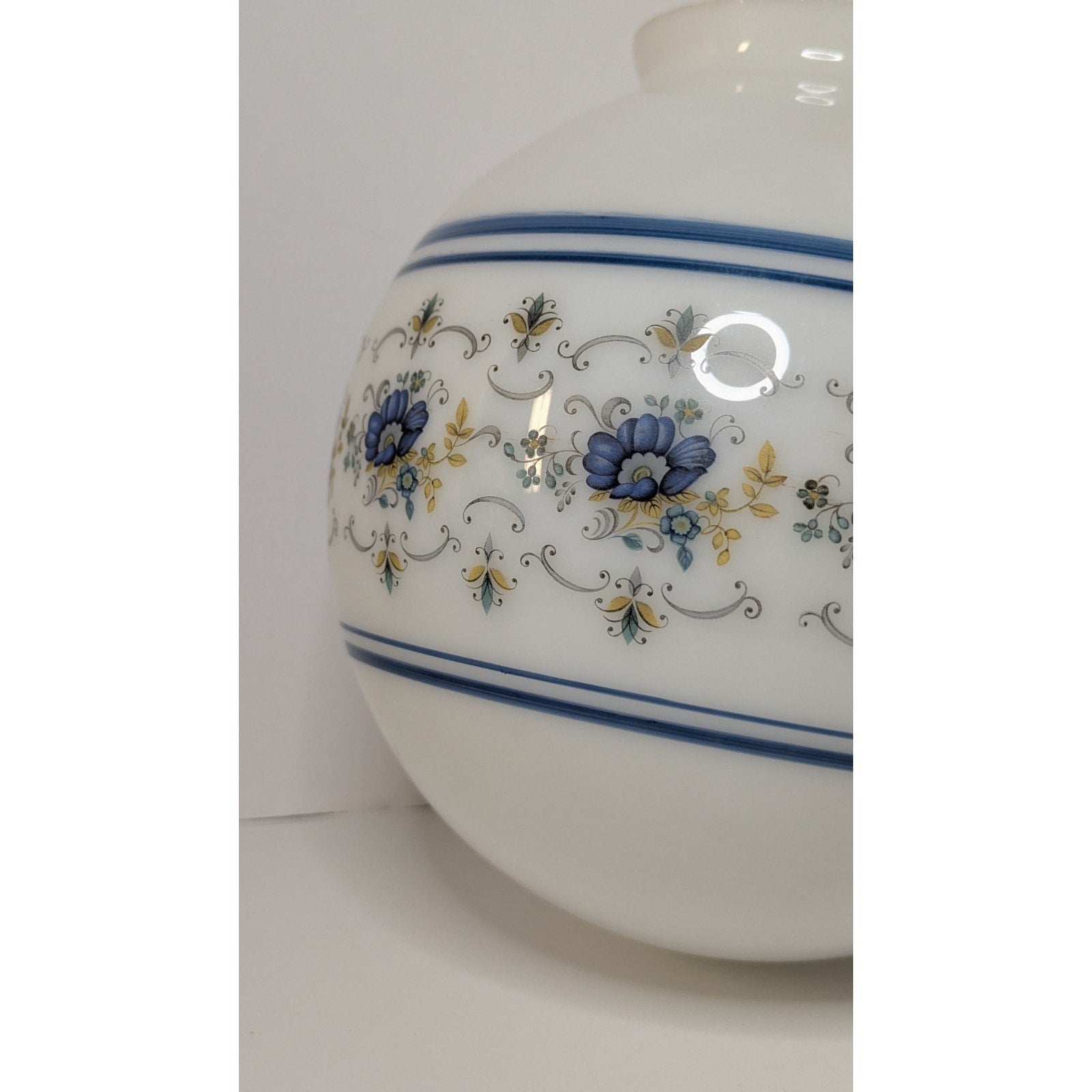 This 8" globe light shade has a 4" fitter and is decorated with the Abigail Adams pattern. Fitter has a bit of wear.