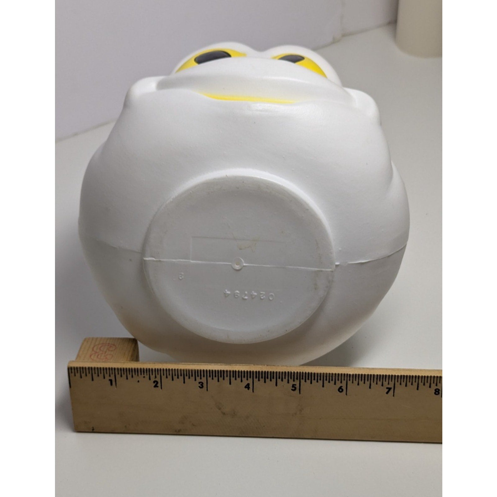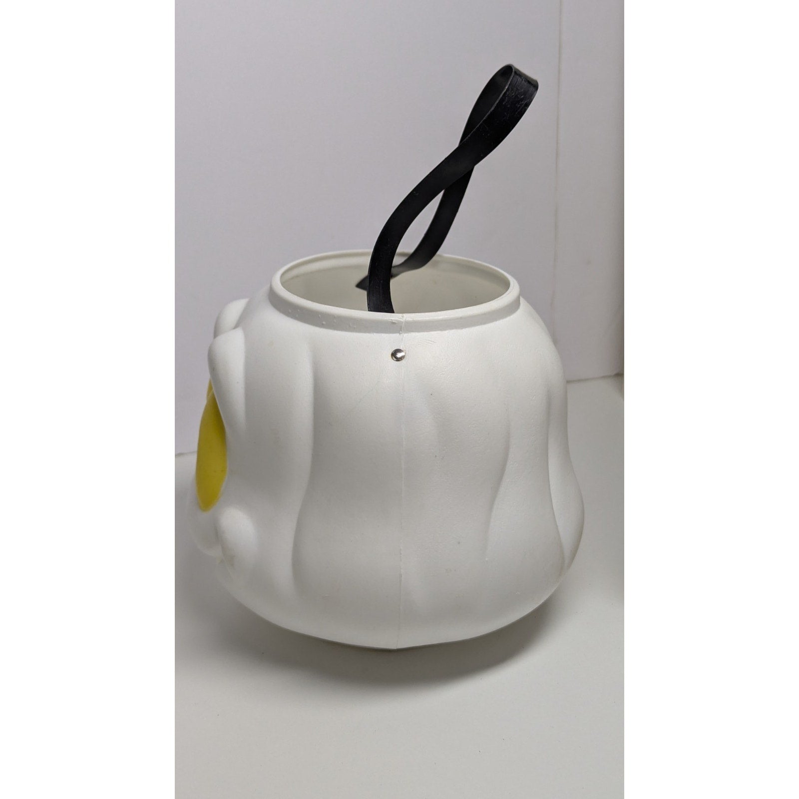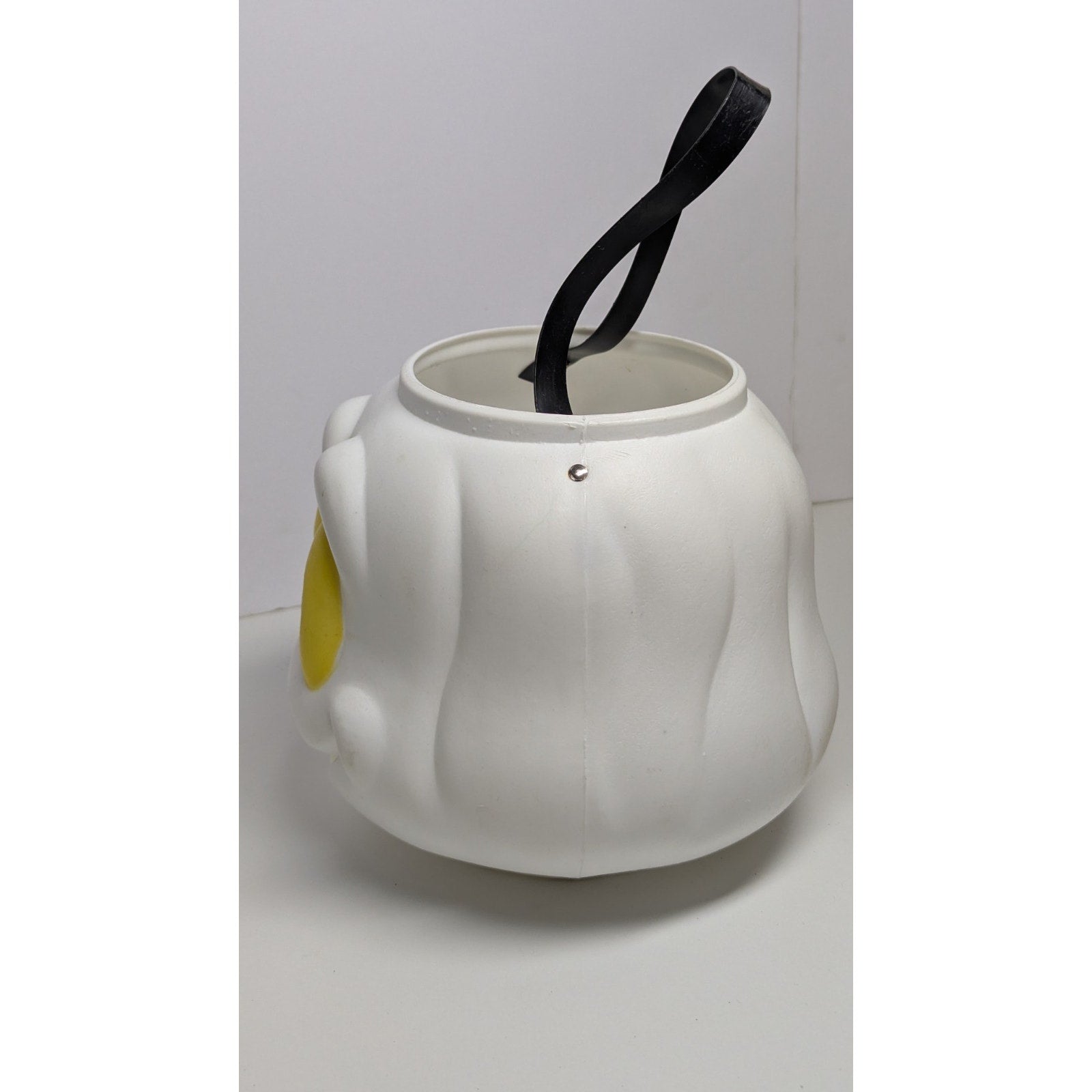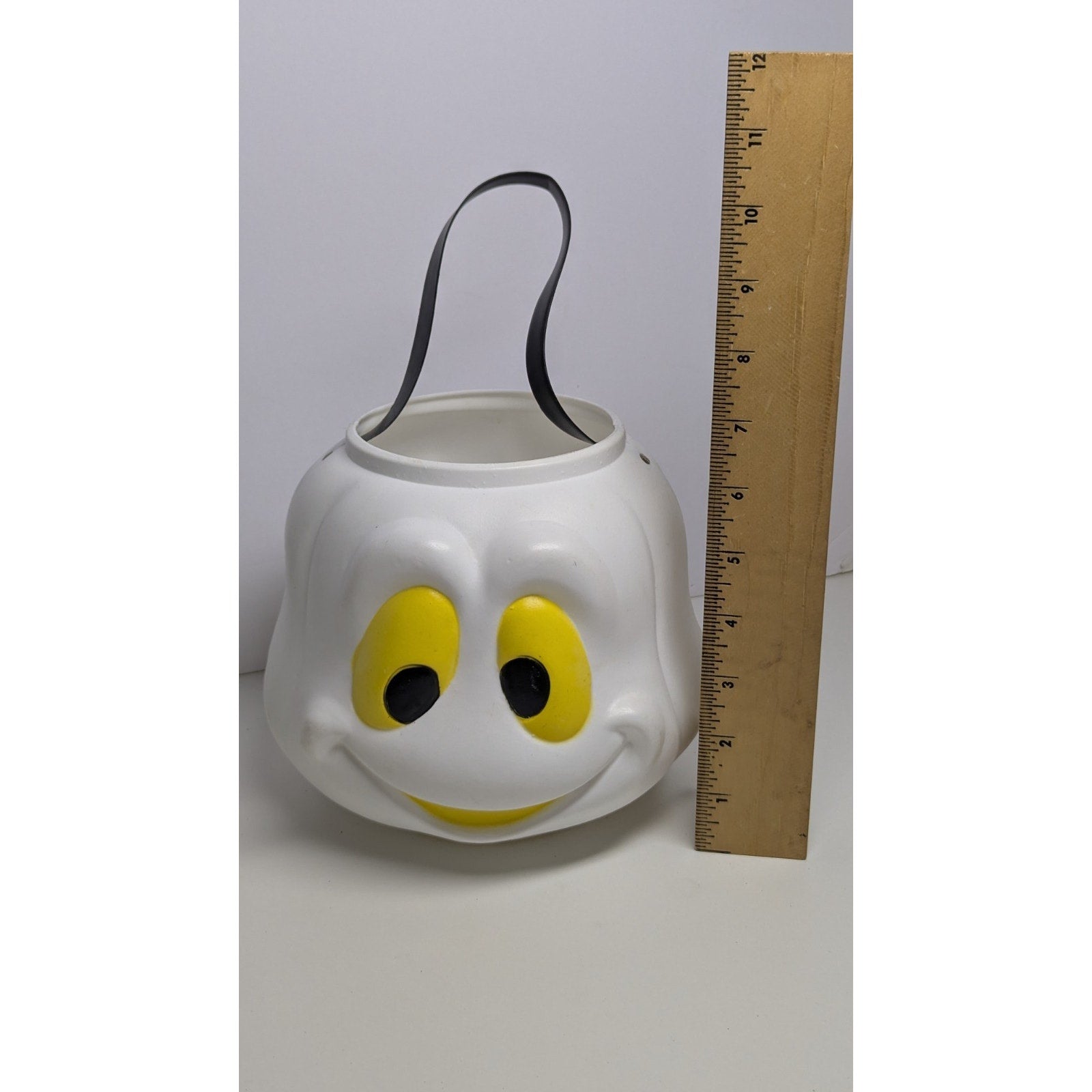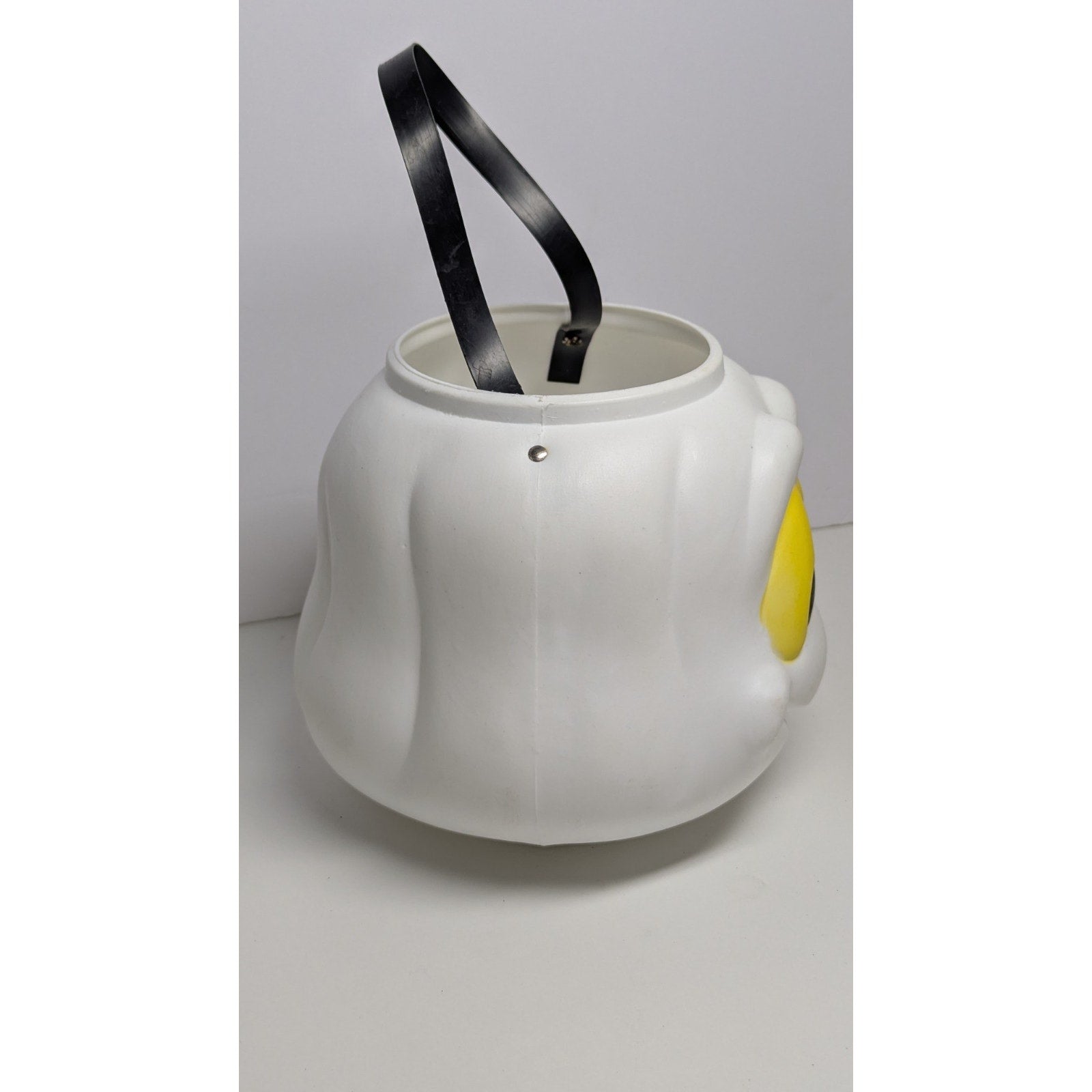 Vintage blow mold ghost candy bucket with yellow eyes. Paint has slight scuffing but is in good condition. White plastic is still very bright. Measures just over 10 inches from top of the handle to bottom of the bucket.
