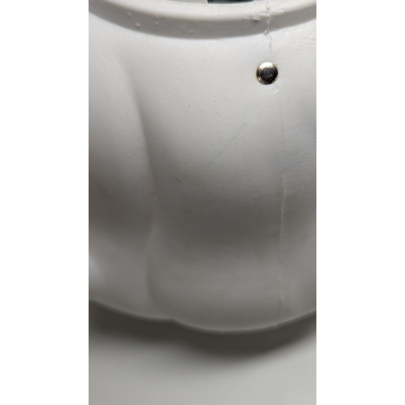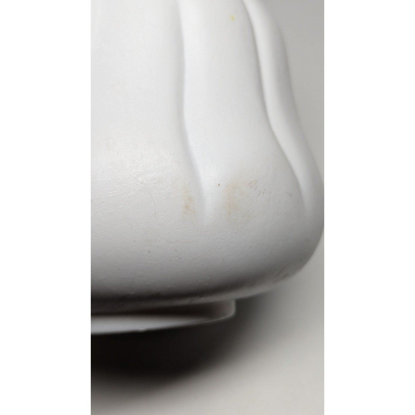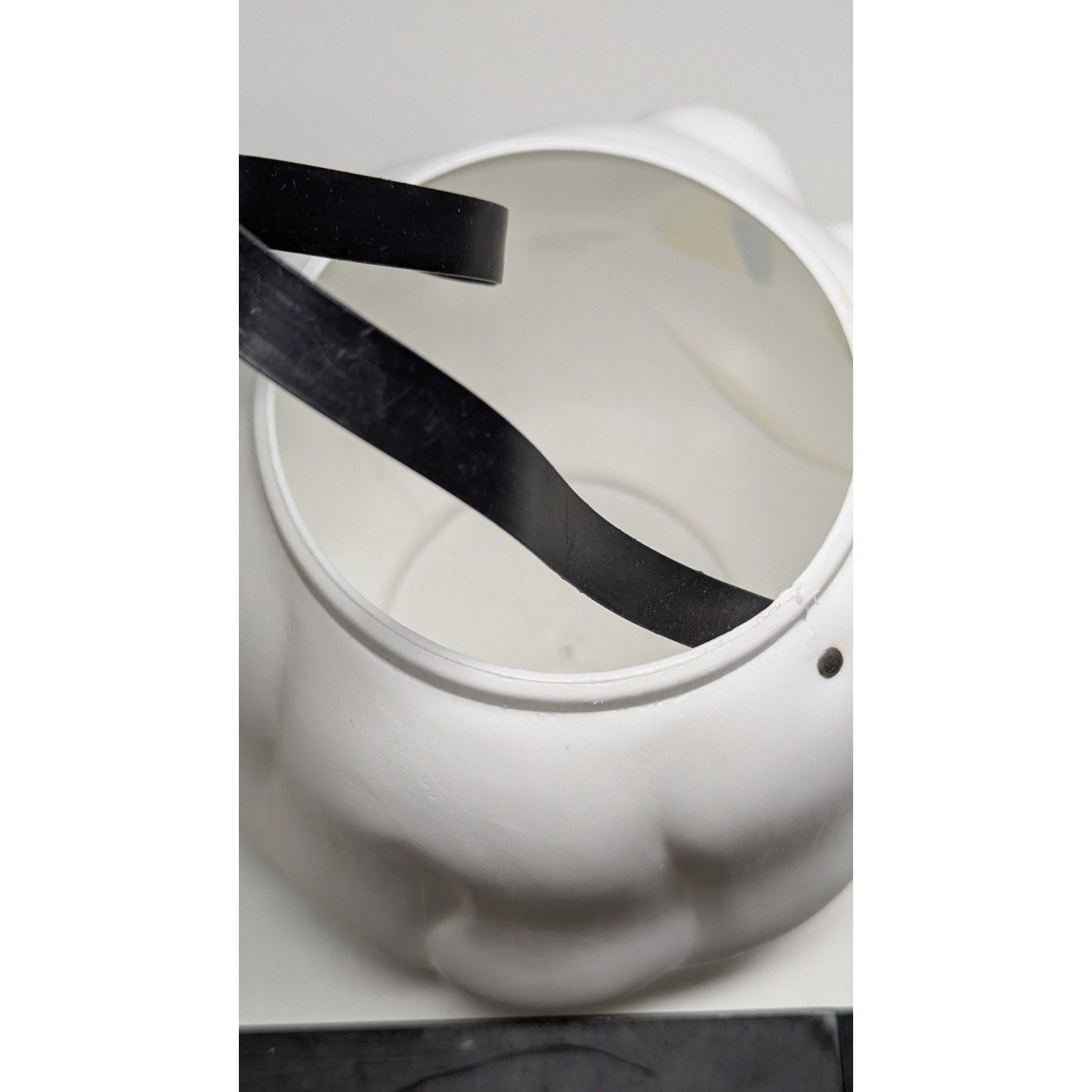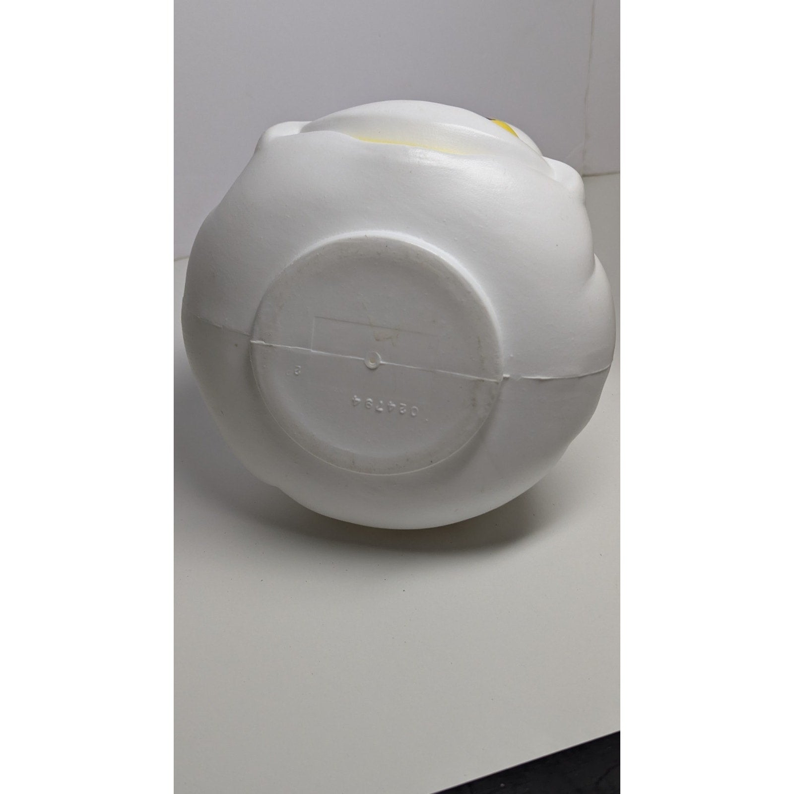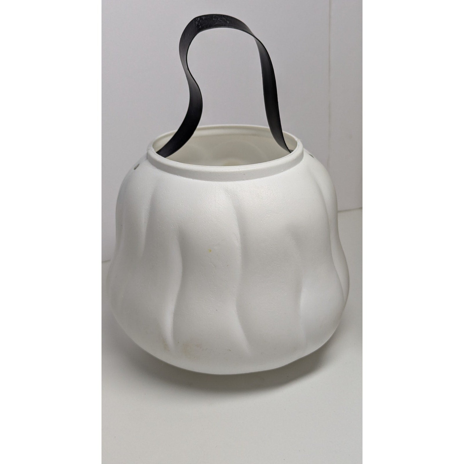 Vintage blow mold ghost candy bucket with yellow eyes. Paint has slight scuffing but is in good condition. White plastic is still very bright. Measures just over 10 inches from top of the handle to bottom of the bucket.